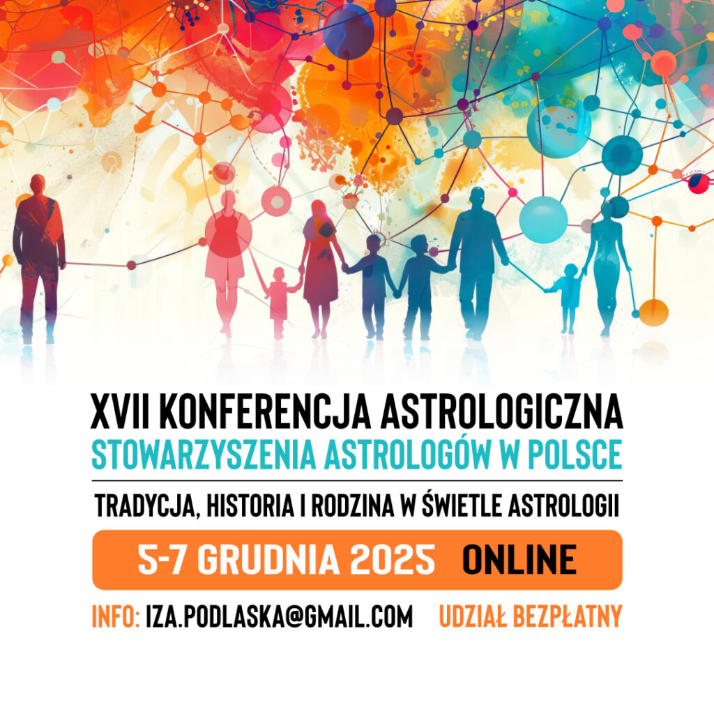 Serdecznie zapraszamy na XVII konferencję astrologiczną Stowarzyszenia Astrologów w Polsce pt. Tradycja, historia i rodzina w świetle astrologii, która odbędzie się ONLINE 5-7 grudnia 2025 roku. Tematem przewodnim konferencji jest powiązanie astrologii z tradycją, historią i sprawami rodziny, czemu patronuje obecny pobyt Jowisza w znaku Raka. Na konferencji wystąpią: Wojciech Jóźwiak, Piotr Gibaszewski, Cyprian Graczyk, Izabela Kiełbowska, Ewa Krajewska, Miłosława Krogulska, Marcin Lechna, Dorota Nowacka, Izabela Podlaska-Konkel, Zofia Szum i Bogdan Zbrzeżny.